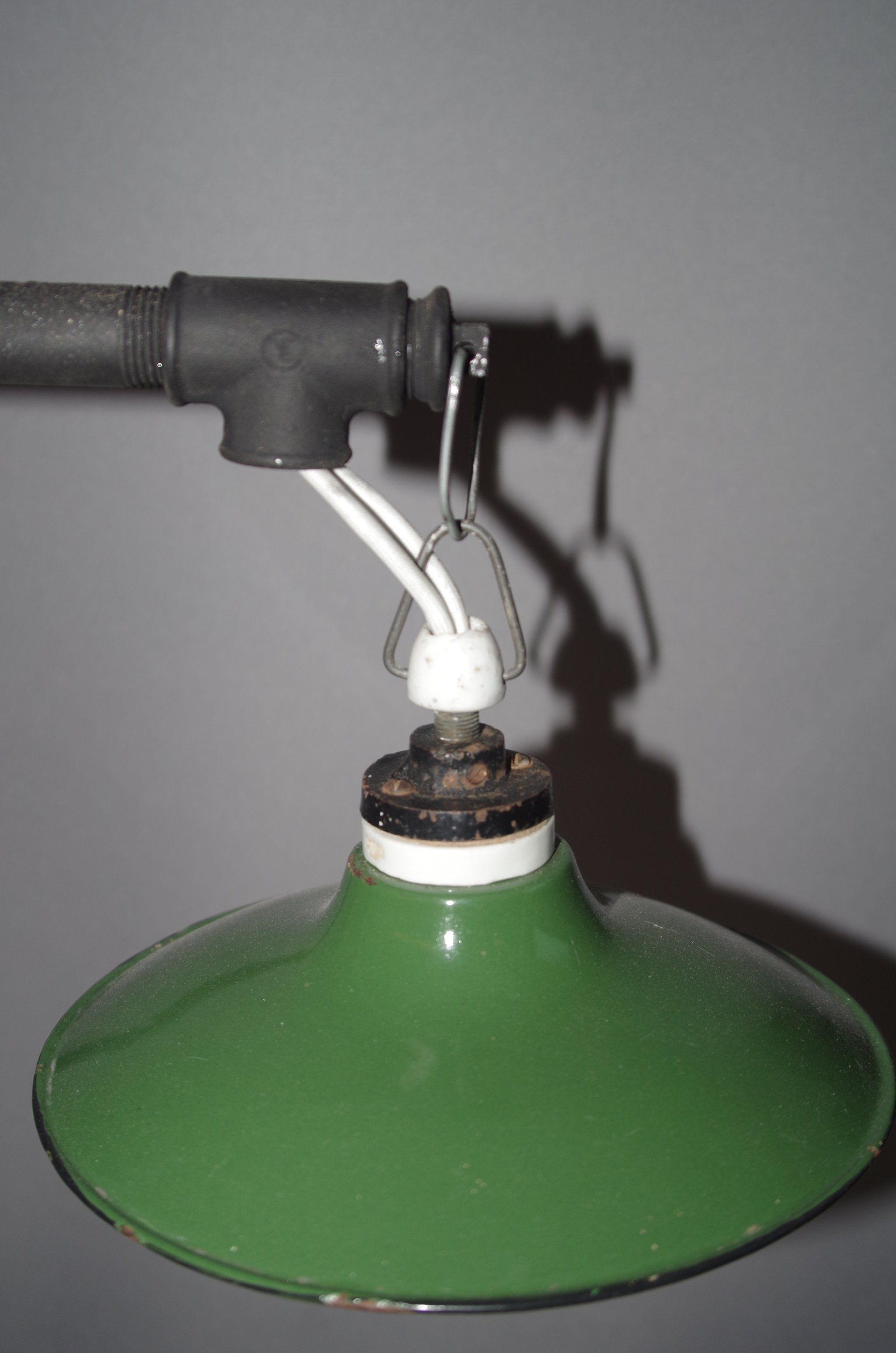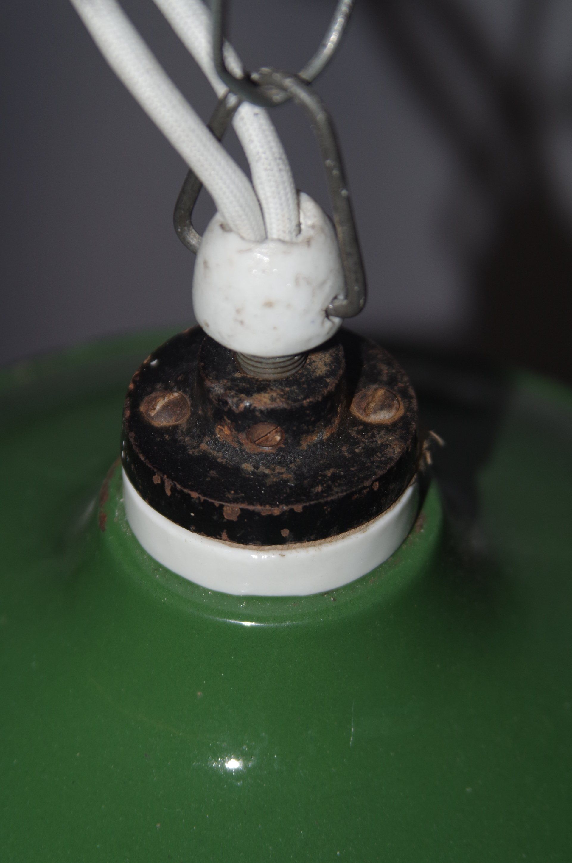 Altes Material wie hier ein alter emaillierter Schirm mit originaler keramischer Lampenfassung wird nach Möglichkeit komplett zerlegt, gereinigt und in seiner Funktion wiederhergestellt.
